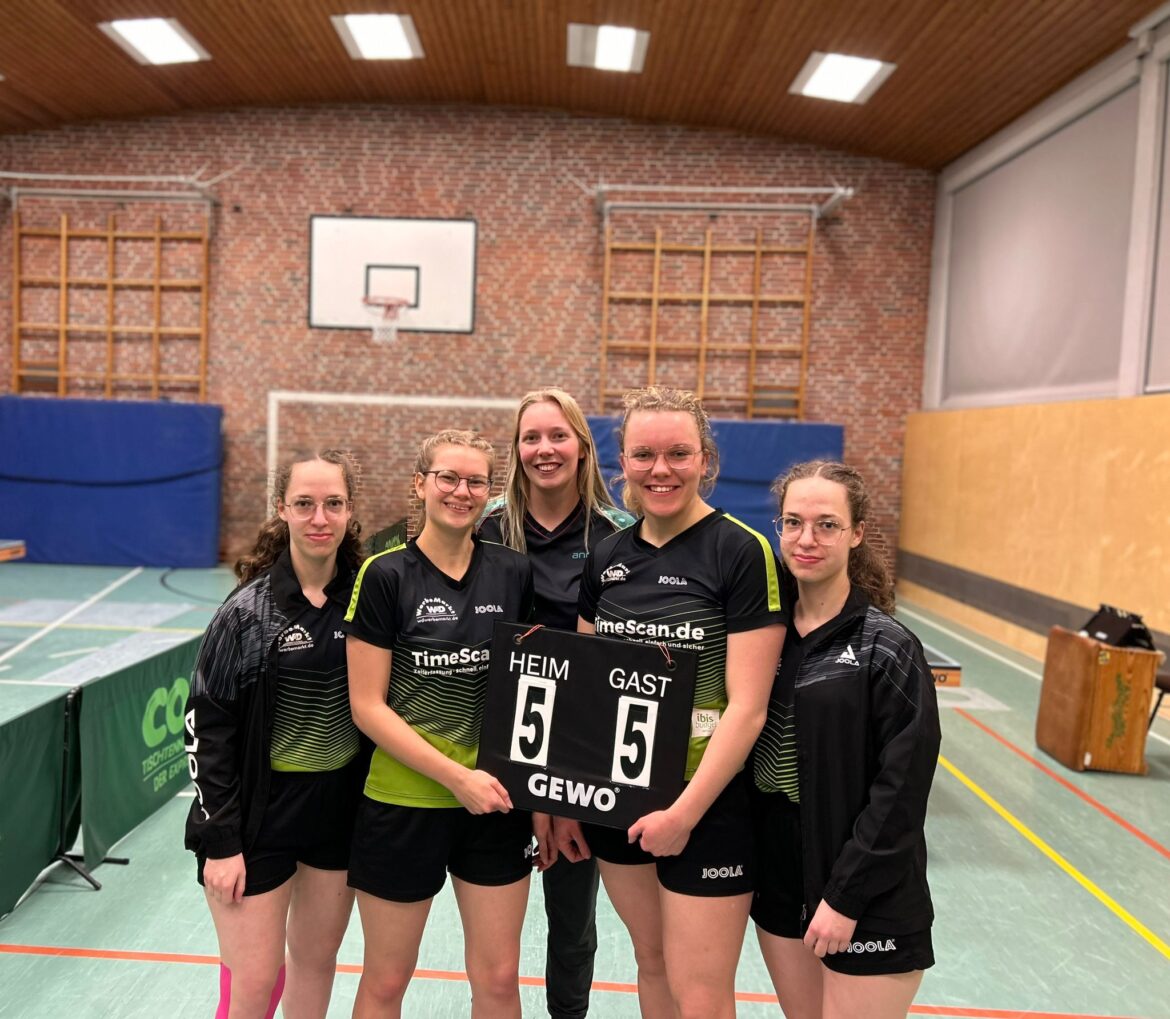 Bei Melissa und Svenja wurde es im Anschluss sehr spannend. Beide gingen in den Entscheidungssatz. Der Ausgleich war möglich. Keiner traute sich aufs Klo, um auch nichts zu verpassen. Die Mannschaftskapitänin hüpfte vor Nervosität von einem Bein auf das andere. Melissa musste nach starkem Kampf um jeden Punkt leider ihrer Gegnerin gratulieren. Svenja hingegen wuchs über sich hinaus und machte den Sack zu. Zwischenstand somit 2:4. Alles noch drin. Jojo und Alina waren fest entschlossen, den Ausgleich zu holen und gingen jeweils mit 2:0 in Führung. Alina konnte im vierten Satz das Spiel für sich und für uns entscheiden. Unsere Nummer 1 machte es entgegen unserer zuvor getroffenen Absprache aber doch nochmal spannend und ging in den Entscheidungssatz. Diesen konnte sie sich mit zwei Punkten Abstand sichern und uns wieder auf Kurs bringen. Nun musste nur noch ein Punkt her, um den zweiten Tabellenpunkt der Saison zu erreichen. Melissa konnte diesen leider noch nicht eintüten. Svenja schien jedoch einen „grandiosen“ Tag erwischt zu haben und spielte einen Topspin nach dem nächsten auf den Tisch. Zum Leidwesen von Jarno, der das Spiel zählte und zuvor eine Menge „Blubberwasser“ getrunken hatte, ging das Spiel (wie sollte es auch anders sein) bis in den fünften Satz. Hier spielte Svenja scheinbar immer einen Ball mehr auf den Tisch als ihre Gegnerin und holte den FÜNFTEN Punkt und somit das UNENTSCHIEDEN! Hier der Link zum Spielbericht.