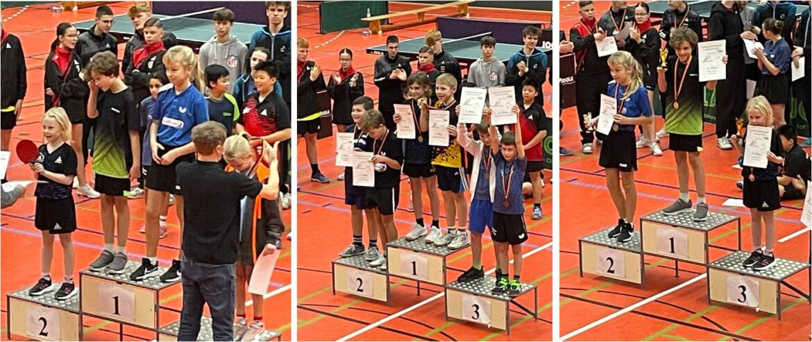 Bei den Mädchen wurde „Jeder gegen Jeden“ mit sieben Teilnehmerinnen gespielt. Damit stand schon fest, dass unsere Mädels auch am Sonntag noch dabei sein können. Tessa konnte zwei Spiele gewinnen, u.a. gegen die Drittplatzierte der vergangenen Landesrangliste, Amy Lou Stengel (Nord-West) gewinnen. Somit reihte sie sich auf Platz 5 der Gesamtwertung ein. Leni wollte noch ein Stückchen höher hinaus und gewann zwei Partien mehr: gegen Tessa und ebenfalls gegen Amy Lou. Somit durfte sie sich über den dritten Platz und einen weiteren Pokal freuen.