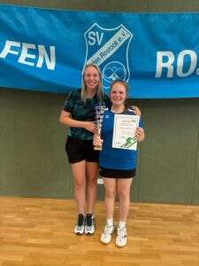 Hier holte sie sich einen weiteren Sieg gegen ihre zweite Dauerrivalin Janne (Nord-West Rostock) und beendete das Turnier auf einem hervorragenden fünften Platz. Da sie noch drei weitere Jahre in dieser Altersklasse antreten darf, können wir mit dem Resultat mehr als zufrieden sein und sind gespannt, was in Zukunft noch möglich sein wird.